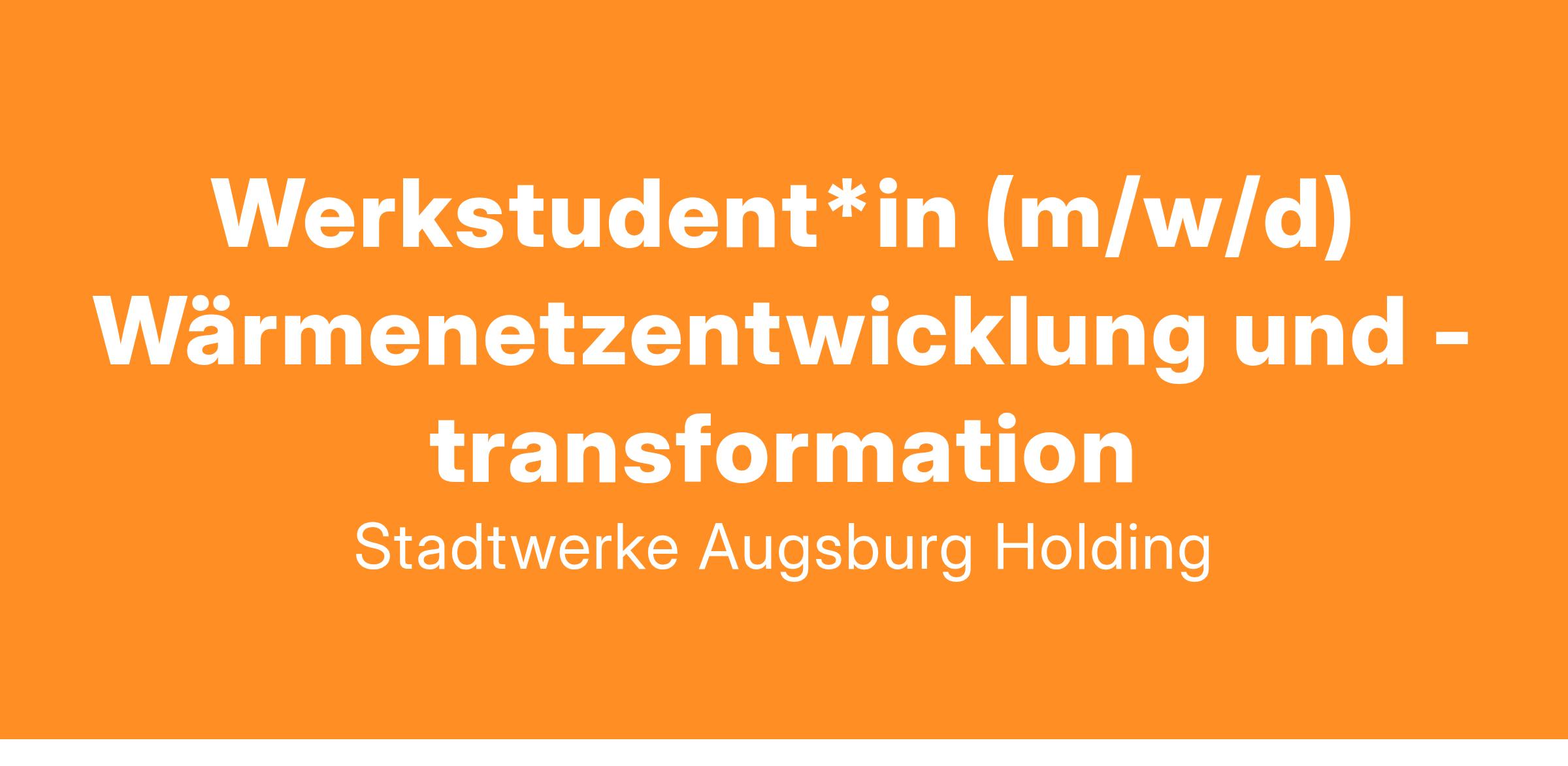 Dir ist es wichtig Dich neben Deinem Studium für die lokale Wärmewende einzusetzen und Du hast Interesse die gesamte Entwicklung eines Wärmenetzes von Erzeugung über Netze bis hin zum Vertrieb kennenzulernen und zu unterstützen? Dann werde Teil der Energie- und Mobilitätswende und liefere als Werkstudent*in (m/w/d) Wärmenetzentwicklung und -transformation Deinen individuellen Beitrag, um Deine Stadt mit sauberer Energie, grüner Mobilität und reinem Trinkwasser zu versorgen!